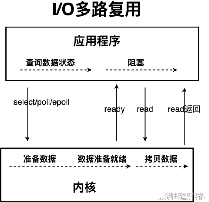 IO 多路复用模型中,线程首先发起 select 调用,询问内核数据是否准备就绪,等内核把数据准备好了,用户线程再发起 read 调用。read 调用的过程(数据从内核空间 -> 用户空间)还是阻塞的