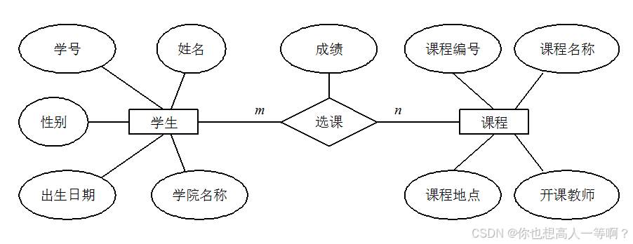 下图是一个学生选课的 ER 图,每个学生可以选若干门课程,同一门课程也可以被若干人选择,所以它们之间的关系是多对多(M: N)。另外,还有其他两种实体之间的关系是:1 对 1(1:1)、1 对多(1: N)。