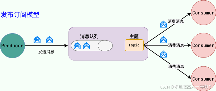发布订阅模型(Pub/Sub) 使用主题(Topic)作为消息通信载体,类似于广播模式;发布者发布一条消息,该消息通过主题传递给所有的订阅者。