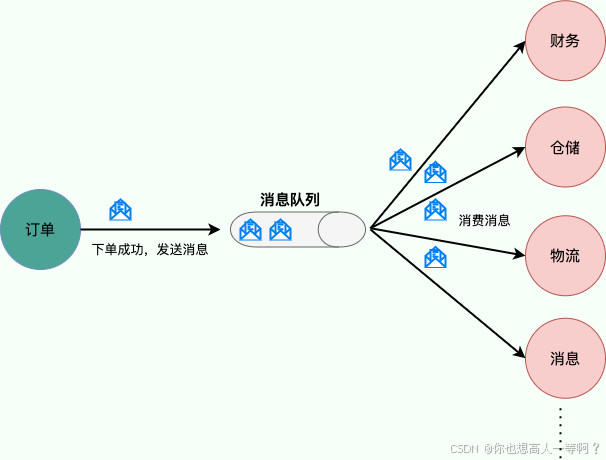 例如,我们商城系统分为用户、订单、财务、仓储、消息通知、物流、风控等多个服务。用户在完成下单后,需要调用财务(扣款)、仓储(库存管理)、物流(发货)、消息通知(通知用户发货)、风控(风险评估)等服务。使用消息队列后,下单操作和后续的扣款、发货、通知等操作就解耦了,下单完成发送一个消息到消息队列,需要用到的地方去订阅这个消息进行消息即可