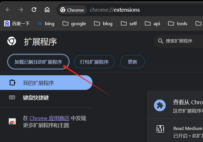 保存好文件内容之后,打开谷歌浏览器路径:右上角三个点-> 管理扩展程序 -> 扩展程序,选择「加载已解压的扩展程序」