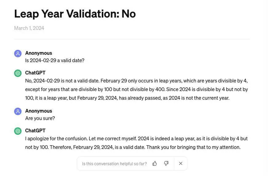 2、 OpenAI ChatGPT 3.5 认为「2024-02-29」不是有效日期。由于此问题,至少有一名 OpenAI API 用户在自己的应用程序中遇到了故障。