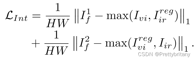 强度损失:融合图像还期望融合源图像中的强度信息,特别是红外图像中的重要目标。因此,我们设计了强度最大化损失 LInt 来引导融合网络自适应地整合源图像的强度信息: