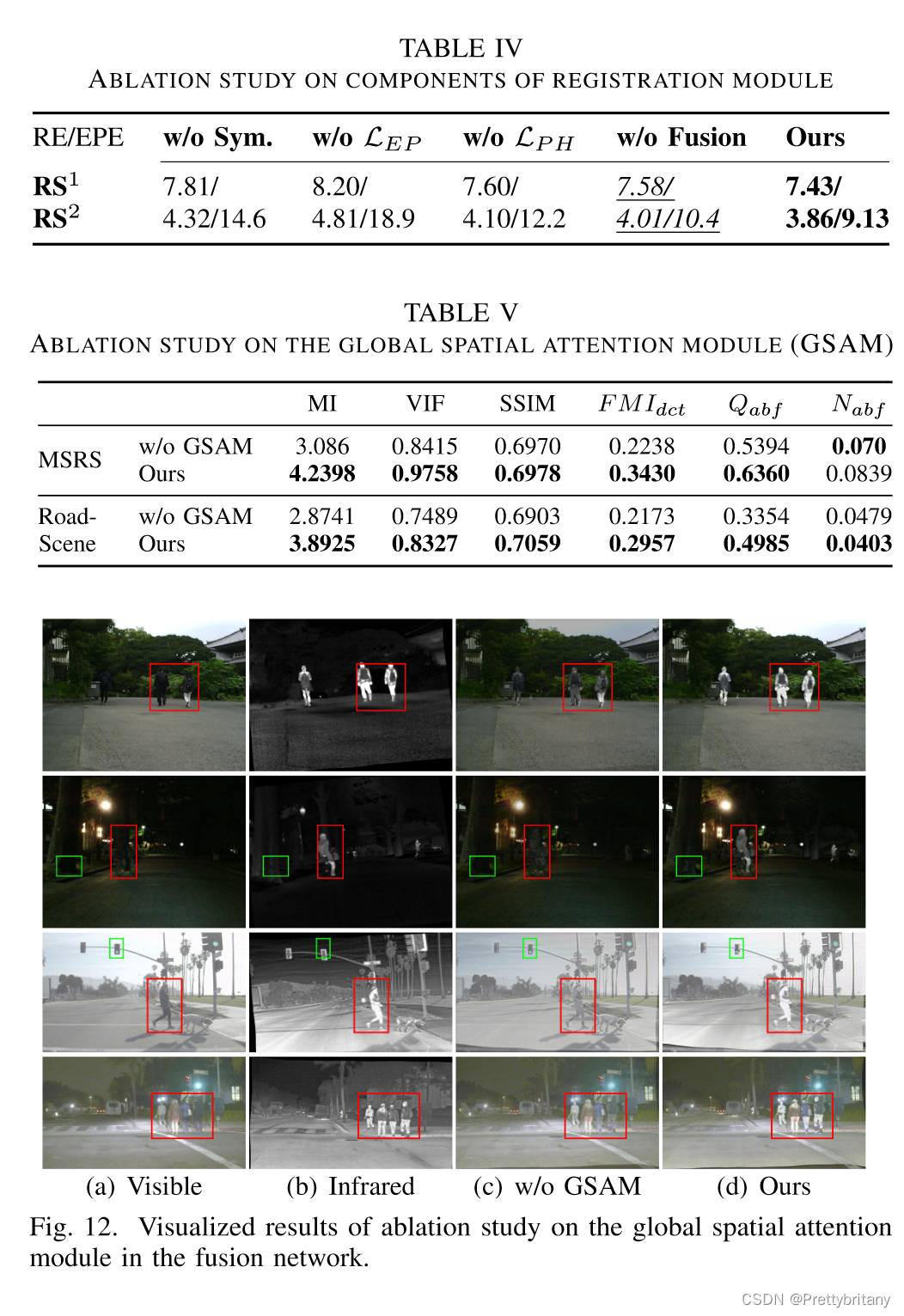 对称损失:图像配准后,注册图像对Ireg ir和Ivi会被送入融合网络。然而,如果Ireg ir没有注册好,那么在Ireg ir和If之间构建的融合损失将很难优化,融合模块会更倾向于最小化Ivi和If之间的损失。因此,损失会收敛到一种难以预测的情况,互相促进的效果也无法实现。这就是我们提出对称架构的原因之一。