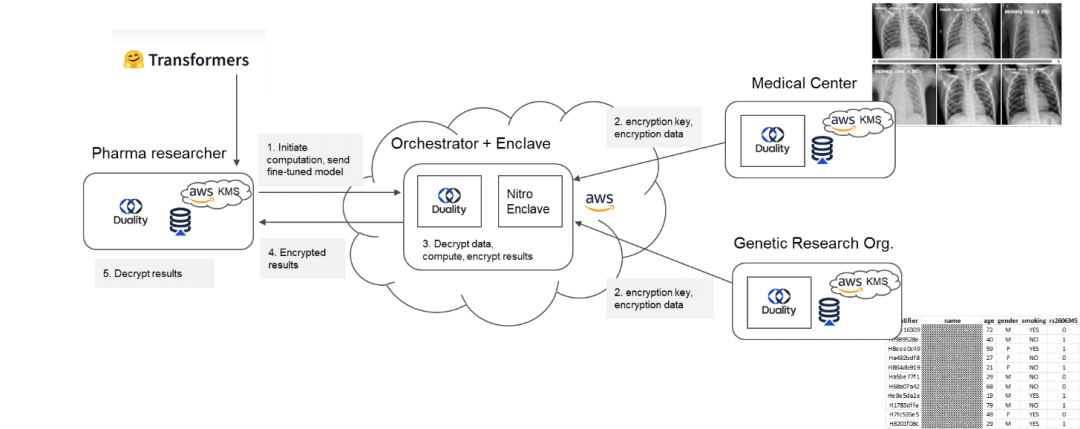 Duality进行了一项概念验证,展示了三个组织之间的协作:一个医疗中心、一个基因研究组织和一个制药研究者。通过Duality平台和云环境中的TEE,这些组织能够共同分析结构化和非结构化的数据,如患者X射线图像、基因信息,同时保持患者身份的私密性和安全性。通过结合Duality的解决方案和TEE,确保敏感数据在整个过程中始终保持加密状态,从而解决了共享敏感信息的隐私顾虑,实现了以前无法实现的安全和协作性分析。