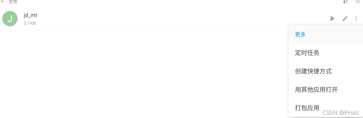 打包需要在手机上或者模拟器中运行,需要安装上篇文章中提到的打包助手,然后在AutoJS App中对想打包的脚本点击右侧的三个小点,选择"更多"->"打包应用"后点击下一步即可将写好的脚本打包成apk。