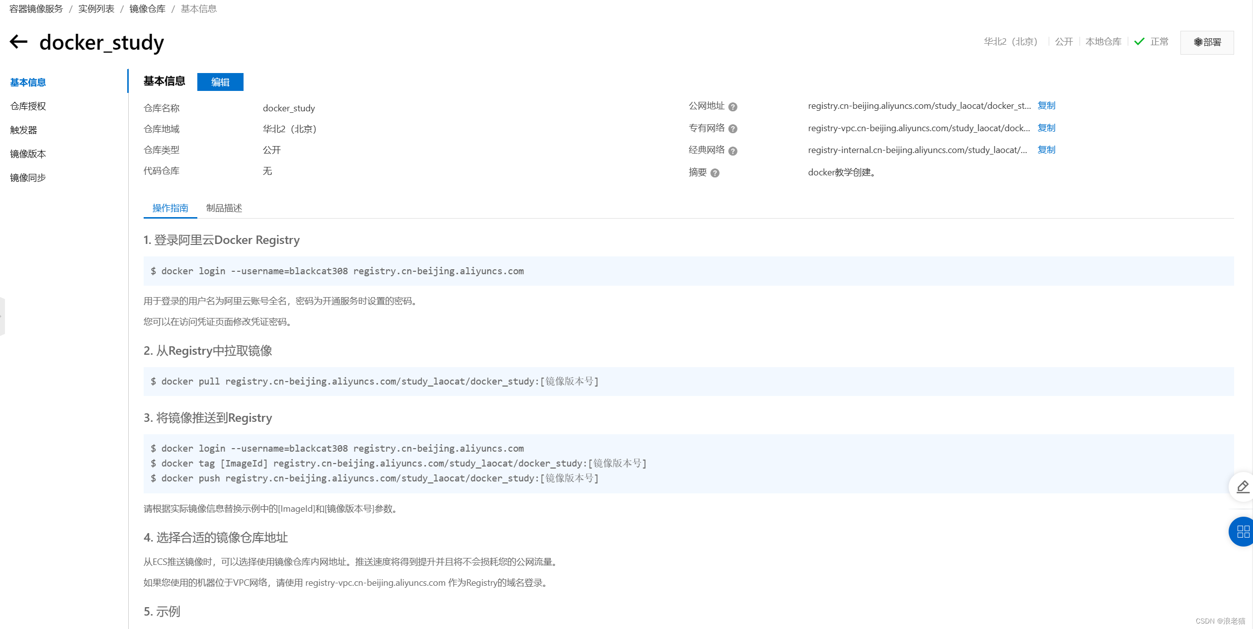 Docker的私有仓库一般有Registry,Portus、Harbor、AppHouse等,这里就不做安装演示,后期会单独出Harbor的安装教程,想学习了解私有仓库,可以先从阿里云私有仓库开始,步骤类似上述步骤。