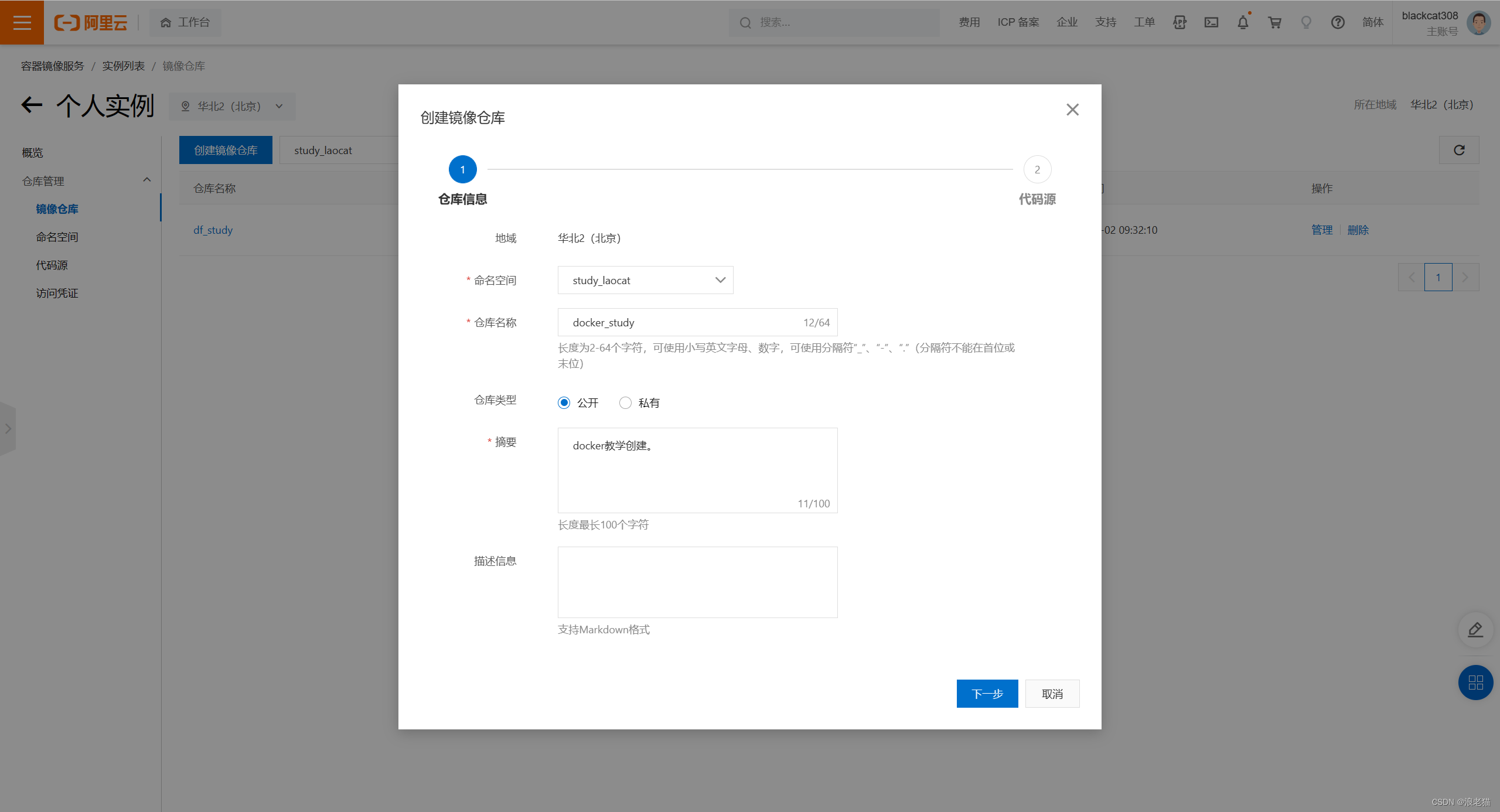 选择镜像仓库,选择自己的命名空间,创建该命名空间下的镜像仓库,这里我们按需选择仓库类型是公有还是私有。