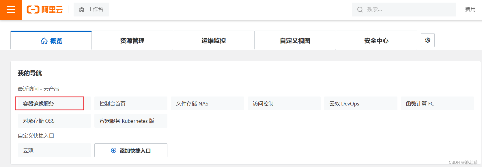 国内读者开发,因为一些特殊原因,会导致上传到官网的镜像出现无法拉取、拉取慢的情况,这里推荐另外的一些国内的云厂商提供的镜像服务,这里只列举阿里云容器镜像服务的操作示例,像其他云厂商提供的镜像服务也都大差不差,就不一一示例了,我们打开阿里云https://www.aliyun.com/,登录后点击控制台,进入该页面,点击容器镜像服务,没有的可以查看前边章节。
