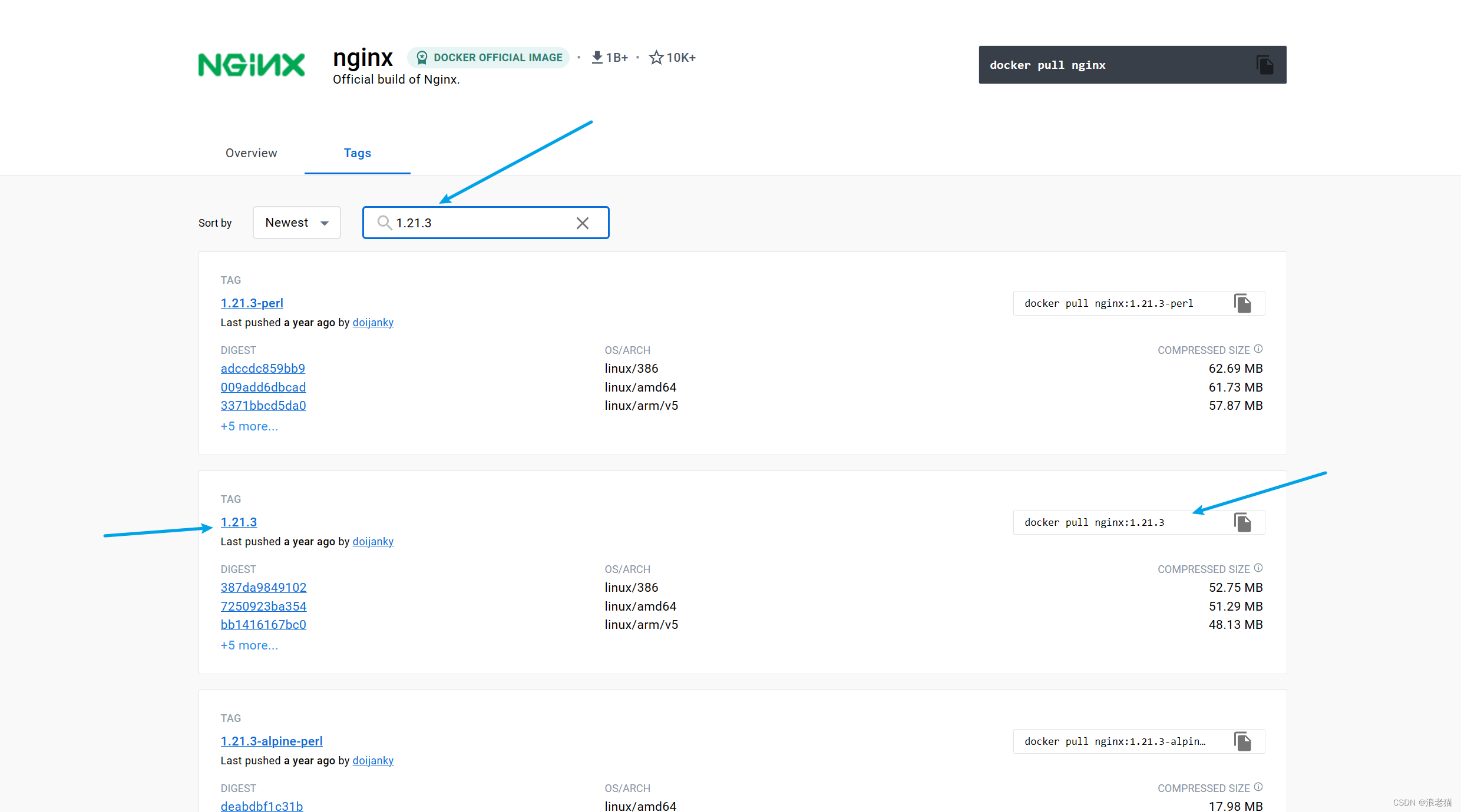 这里并不推荐直接复制右侧命令就直接粘贴到控制台输入回车,前边镜像章节我们说过镜像的(tag)版本非常重要,故我们这里点击tag,输入对应(tag)版本,选择复制这里右侧的Docker命令来进行镜像拉取。
