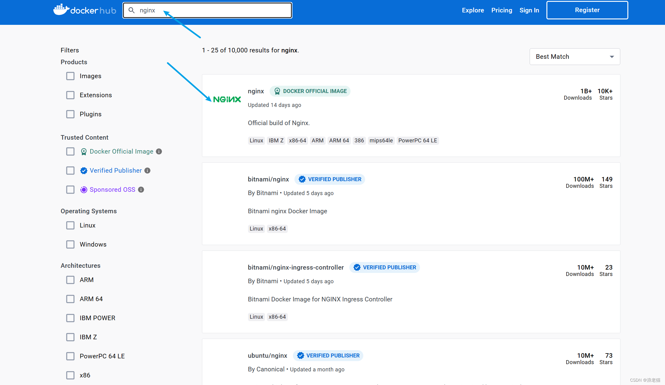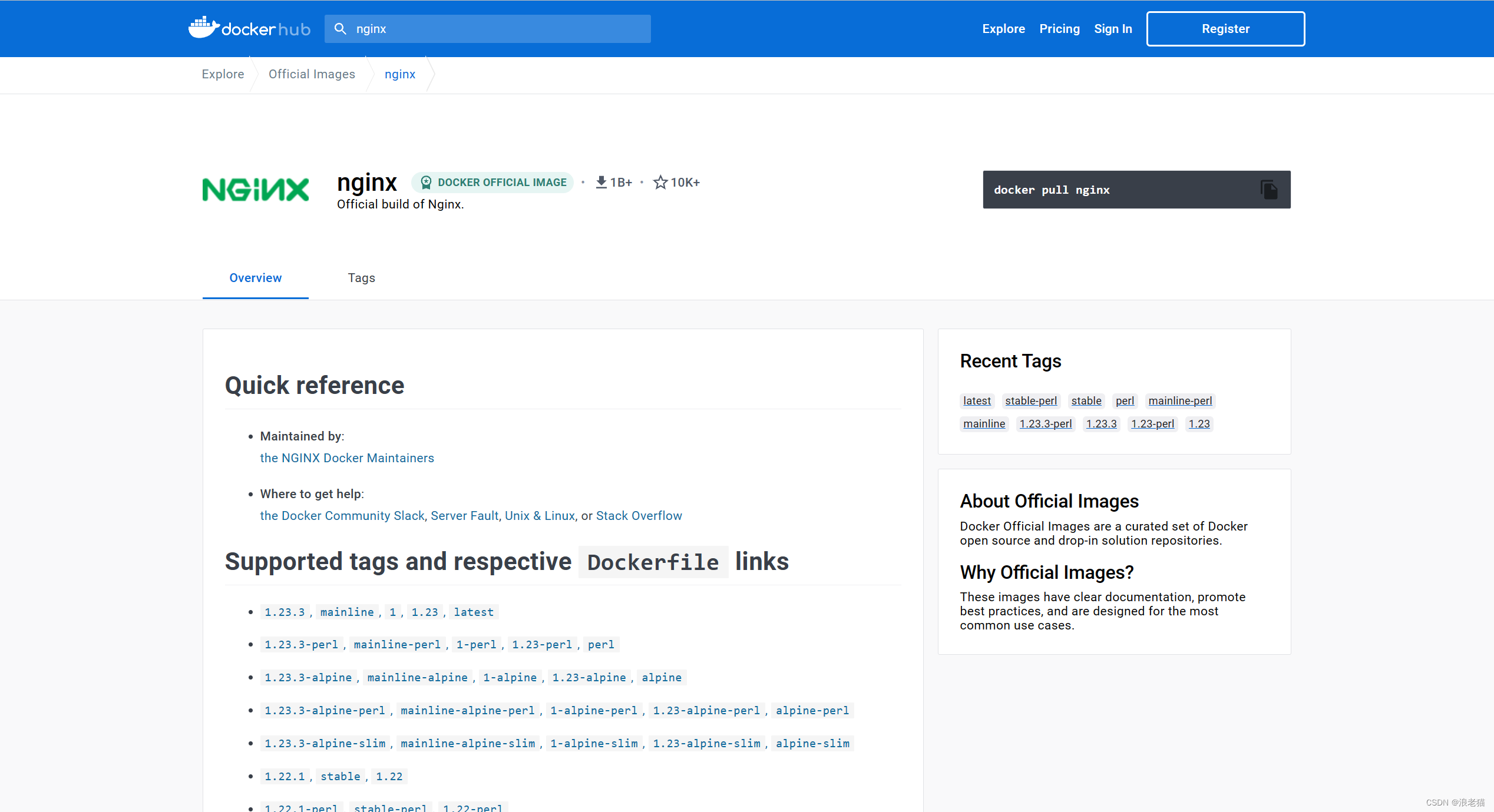 大部分的Docker镜像,我们可以访问https://hub.docker.com/,在搜索框输入对应镜像名称,即可找到对应的镜像,这里以nginx为例。