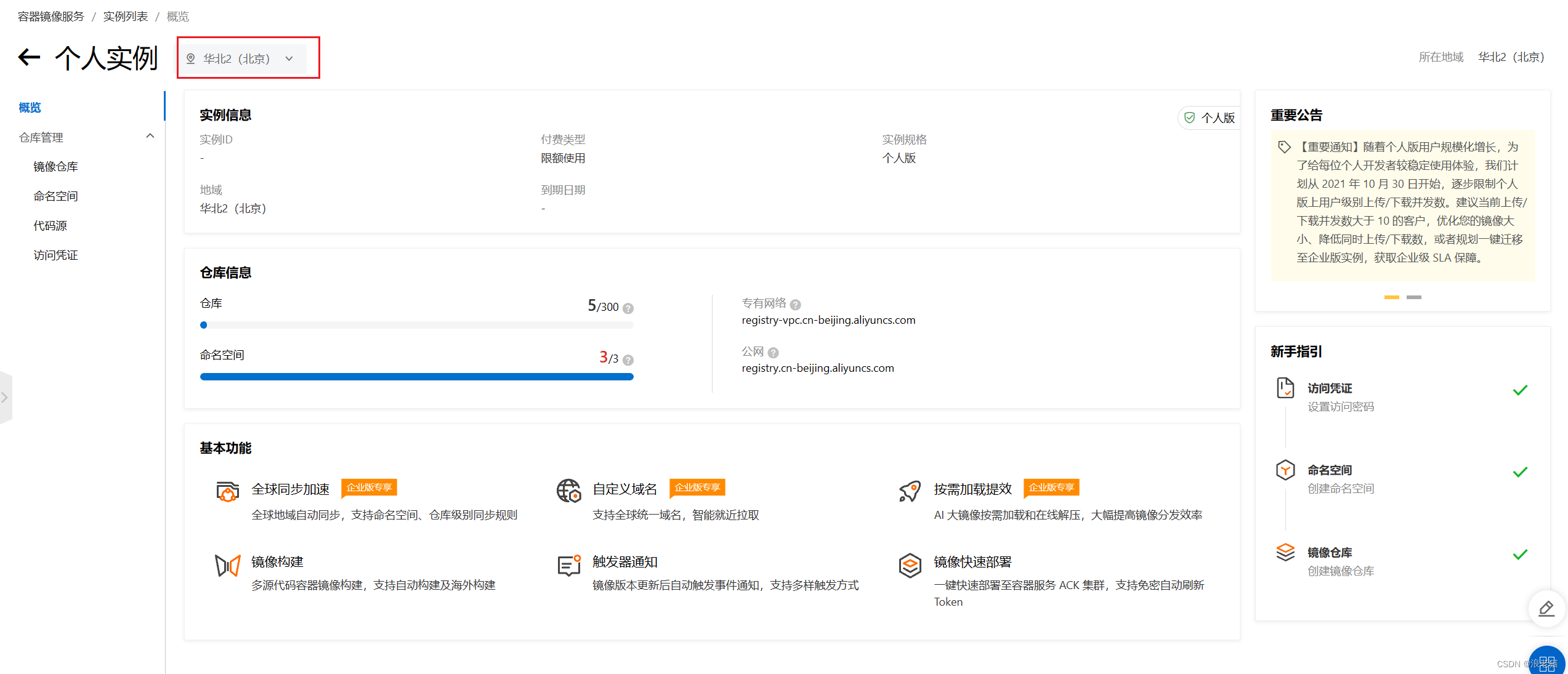 点击后,进入如下页面,这里我已经授权过且创建好了自己的命名空间,没有的读者可以自己授权一下,创建一下,非常简单,但需要注意自己创建的区域和访问凭证(密码)。