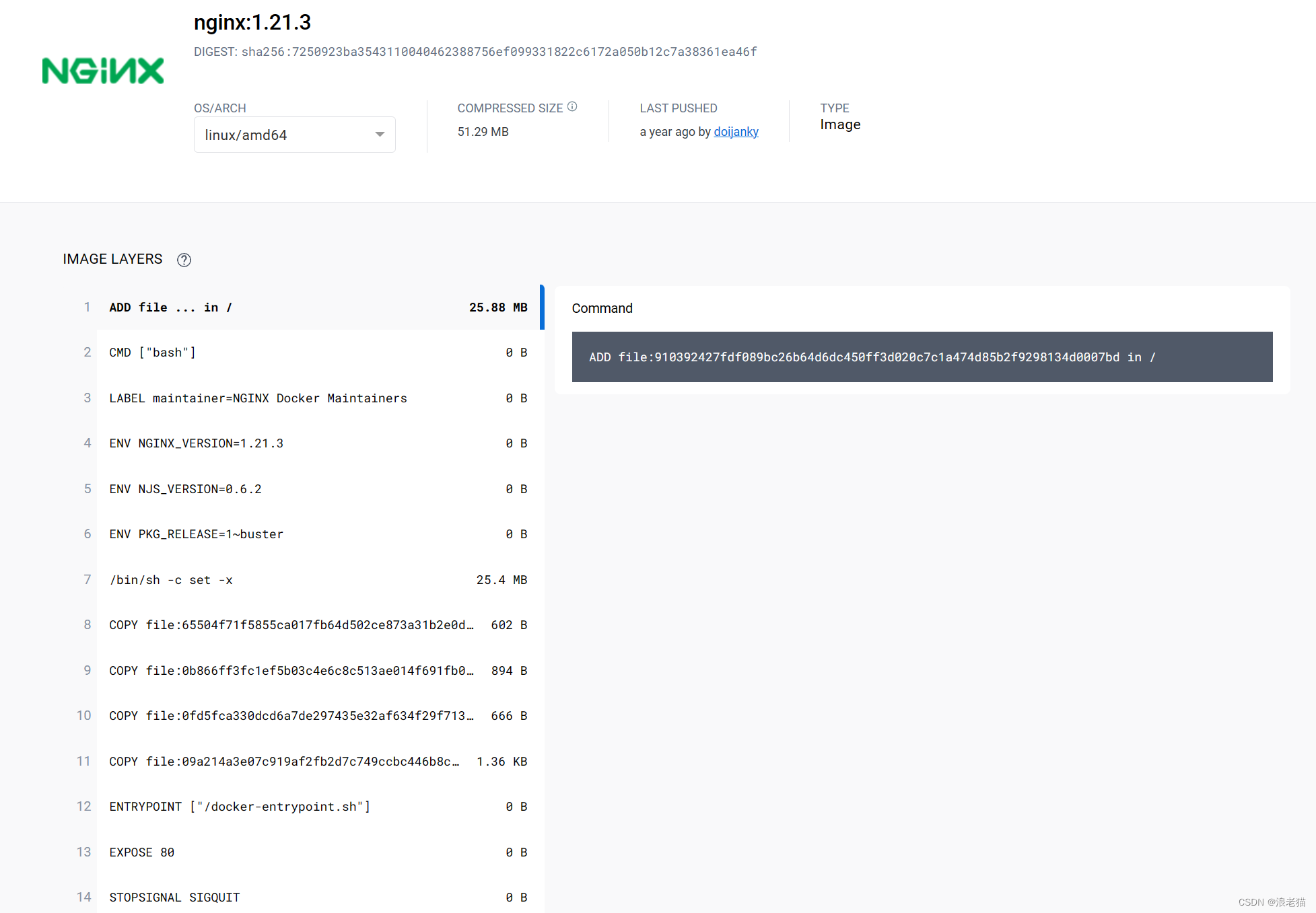 想要了解对应的镜像每一层都做了什么,可以点击对应tag,进入到镜像详情页面,可以在详情页面了解到镜像最后上传时间与上传者以及镜像大小,每一层镜像命令等。