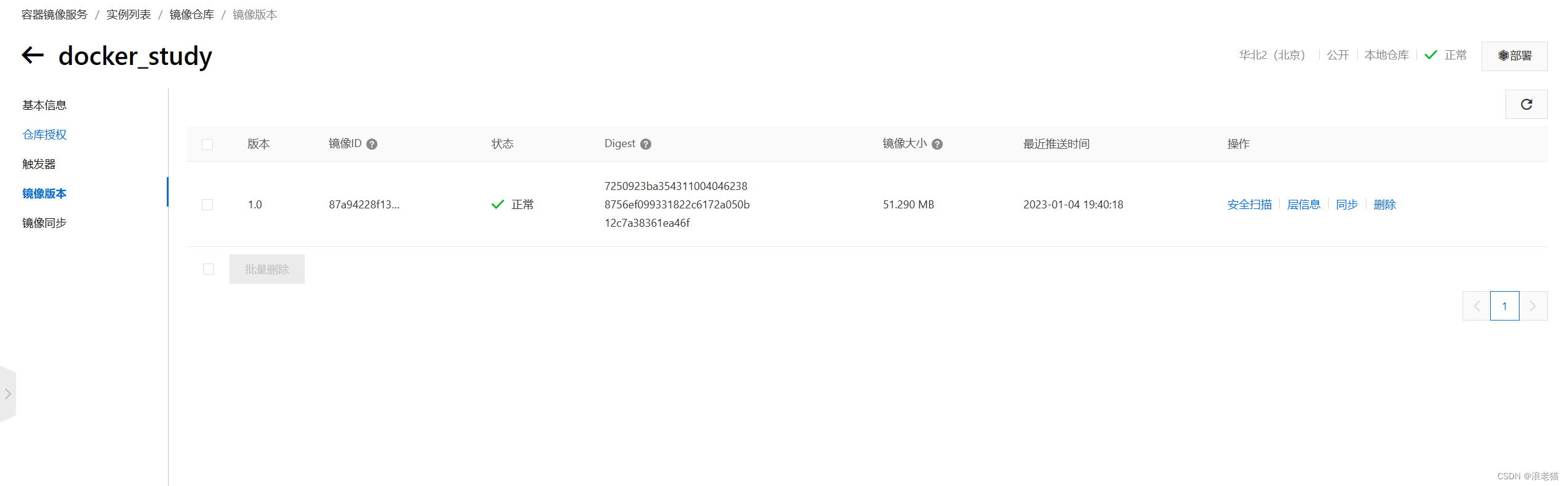上传成功后我们查看阿里云镜像仓库,点击镜像版本即可看到刚刚上传的镜像。