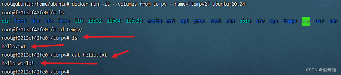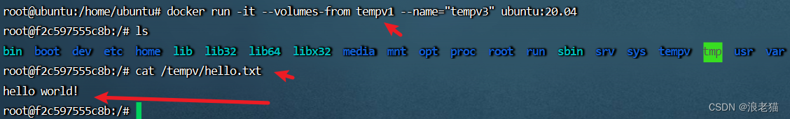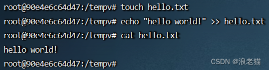 此时,tempv1和tempv2都挂载的同一个数据卷容器tempv,且挂载相同目录tempv,任意容器该目录下的操作,都会在其他容器中看到,比如我们在该目录下增加一个文件hello.txt并输入内容,执行命令如下。