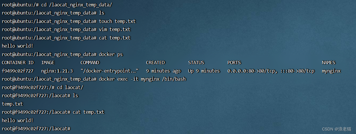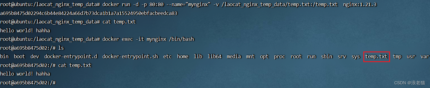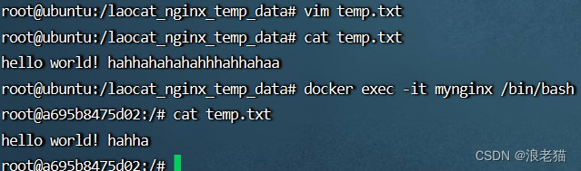 我们添加一个文件temp.txt到该宿主机目录下,然后神奇的一幕出现了,容器内的laocat目录也出现了temp.txt文件,并且内容一致。
