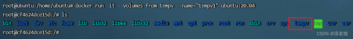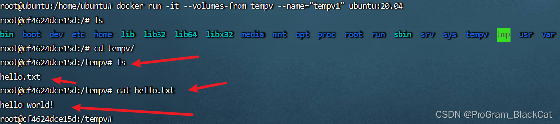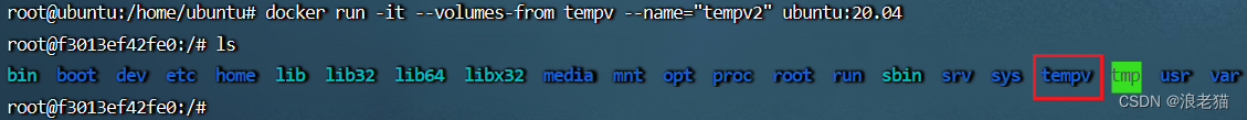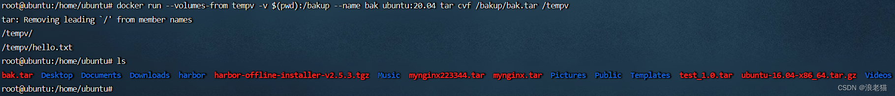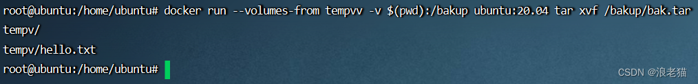 然后创建另一个容器,挂载tempvv的容器,并使用untar解压备份文件到所挂载容器卷中,执行命令如下。