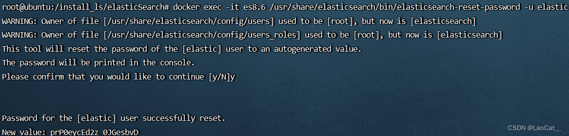 docker exec -it es8.6 /usr/share/elasticsearch/bin/elasticsearch-reset-password -u elastic将会重新生成elastic账户的密码。