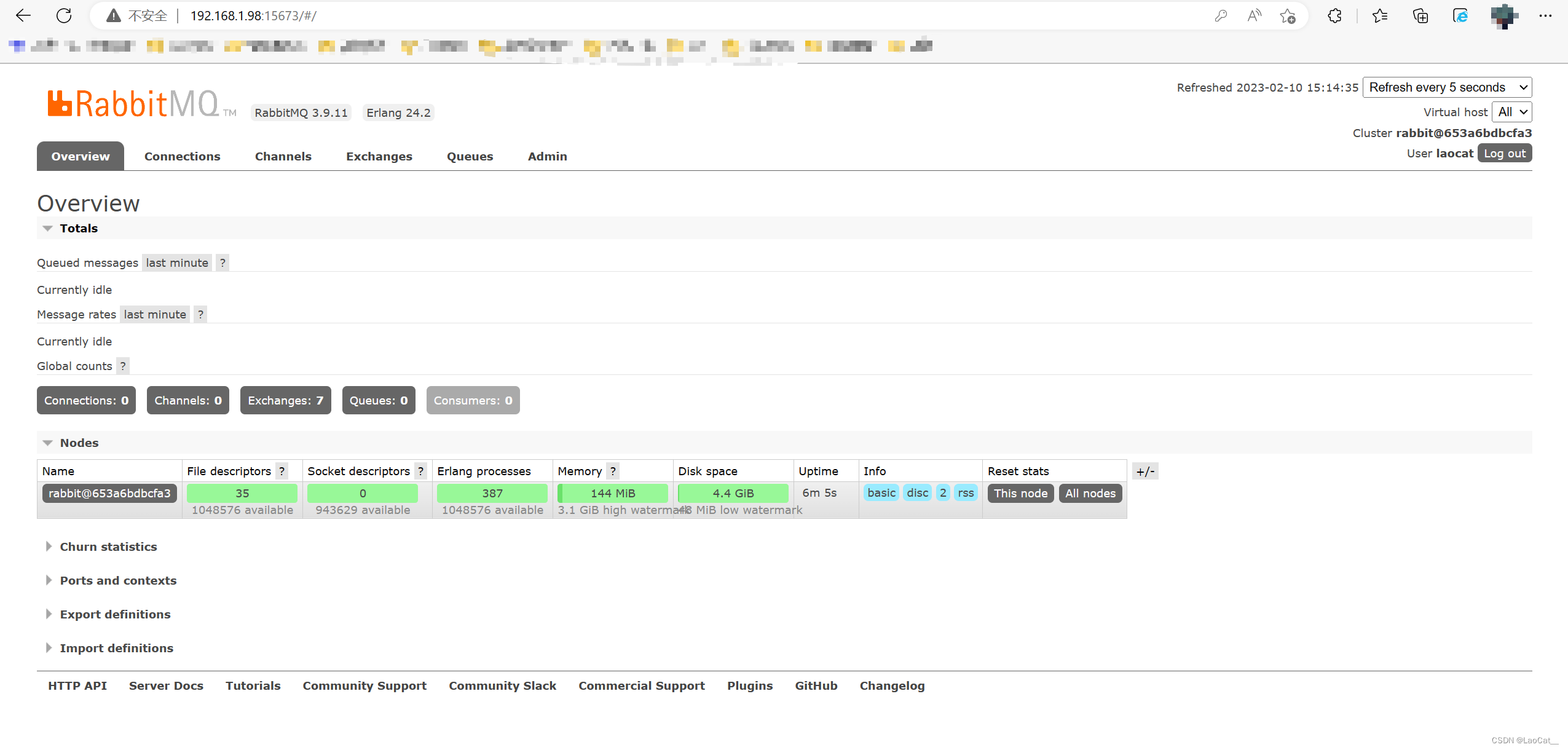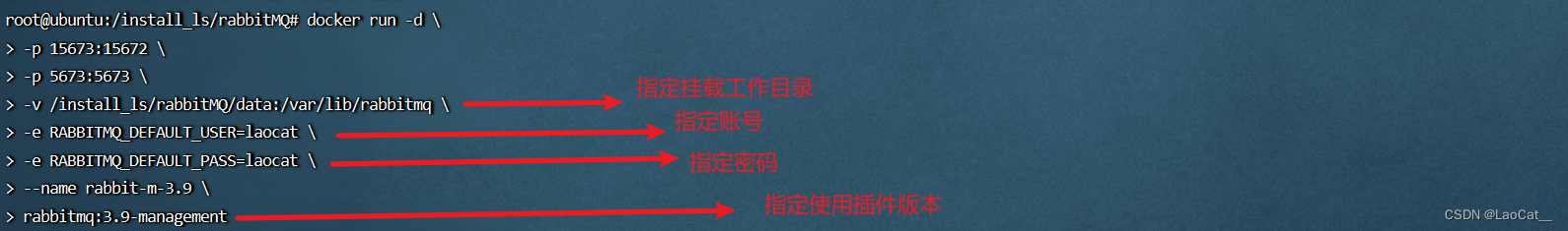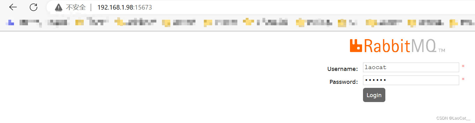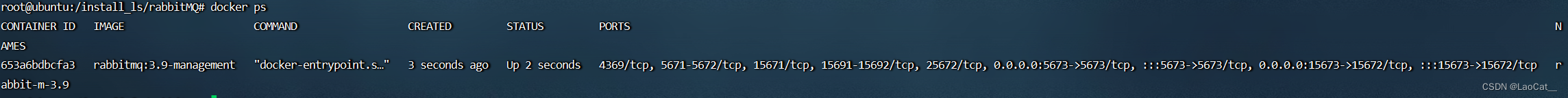 RabbitMQ容器,执行命令。docker run -d \ -p 15673:15672 \ -p 5673:5673 \ -v /install_ls/rabbitMQ/data:/var/lib/rabbitmq \ -e RABBITMQ_DEFAULT_USER=laocat \ -e RABBITMQ_DEFAULT_PASS=laocat \ --name rabbit-m-3.9 \ rabbitmq:3.9-management
