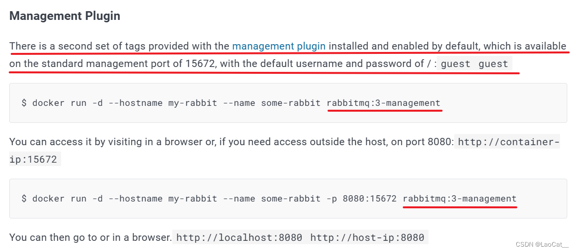 我们这里使用了RabbitMQ插件版本,无需进入容器内部去开启插件,当然小伙伴们也可以使用非插件版本,官网也对此进行了说明。