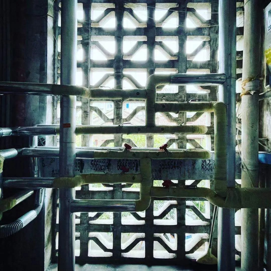 楼道里新修的暖气管,崭新的钢管和风化的墙面对比如此强烈
