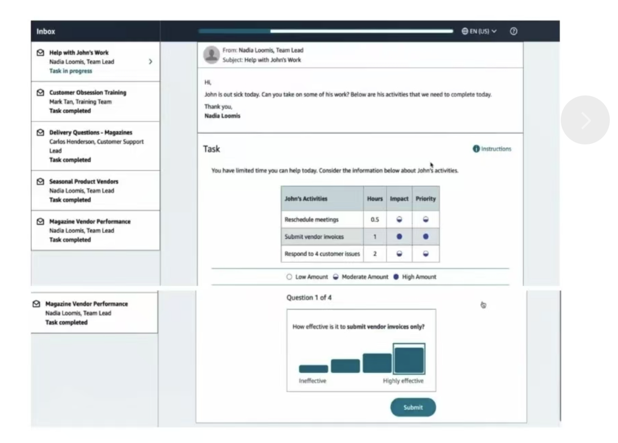 ● 避开雷区: 避免选择那些推卸责任、消极被动、或将问题上报给经理的选项。亚马逊欣赏主动解决问题的人。