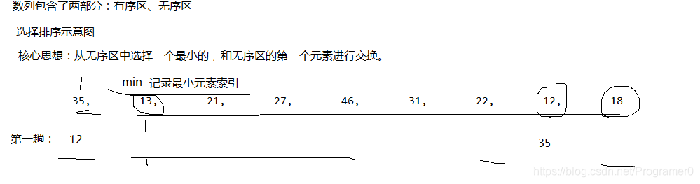 public static void main(String[] args) { int[] arr={26, 53,48,11,13,48,32,15}; selectSort(arr); System.out.println(Arrays.toString(arr)); } //选择排序的实现 public static void selectSort(int[] array){ //控制k值,k指向无序数列中的第一个元素 for(int k=0;k<array.length-1;k++){ //定义一个变量存放无序区最小元素下标索引 int min = k; //查找无序数列中最小的元素的索引 for(int j=k;j<array.length;j++){ if(array[j]<array[min]){ min=j; } } //将最小元素放在无序数列中的第一个位置 if(min!=k){ //完成数据的交换还可以使用 int temp=array[k]; array[k]=array[min]; array[min]=temp; } } } }