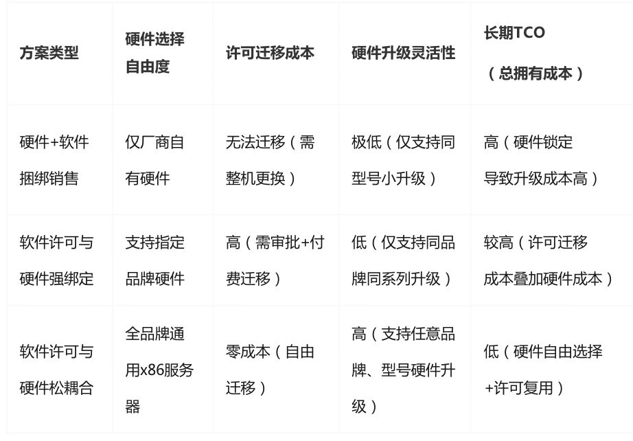 隐藏风险 :后期硬件故障需更换时,只能选择同品牌同型号服务器;若想升级更高配置(如从Intel Xeon E5升级到E7),需重新购买包含新硬件的“整机方案”,原软件许可无法迁移,相当于为相同的软件功能二次付费。