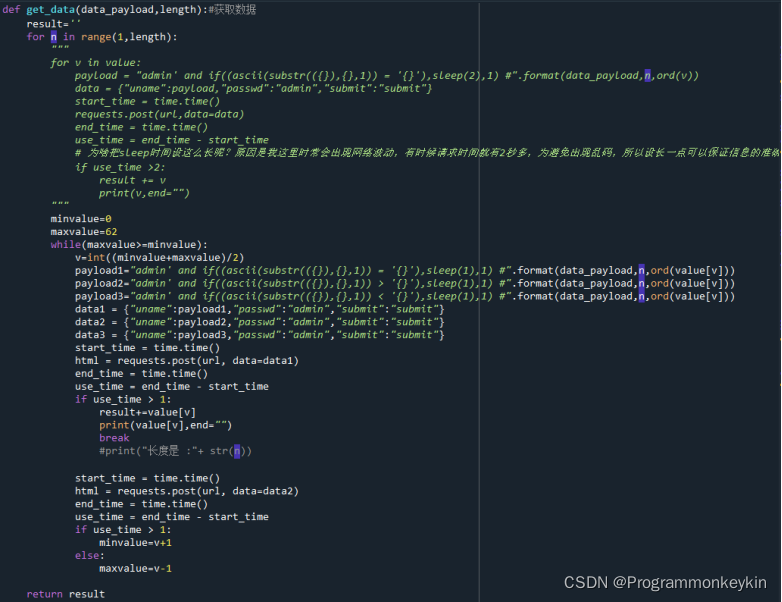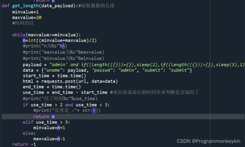 于是我们就可以通过导入的time库,计算完成一次sql盲注的时间,从而判断我们盲注的是否正确。