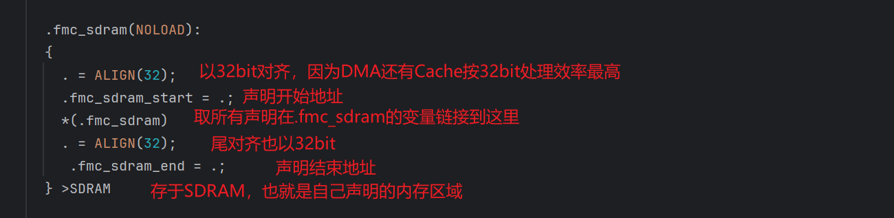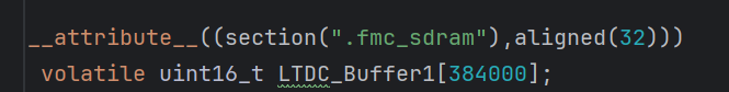 使用关键字attribute__来指定某一个section,这样链接器就知道该把这个数组以32位对齐的方式链接到外部SDRAM了,