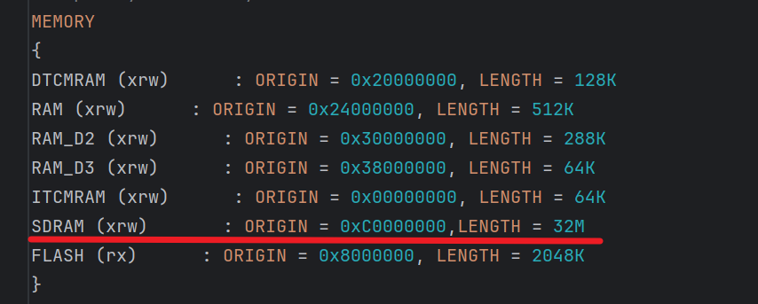 所以我们在配置好FMC/FSMC后需要手动来.ld文件里面添加一行以声明你外扩的RAM,但是在声明之后,链接器只是知道有这么一块空间而不知道该把什么样的数据以什么样的形式链接到这块空间,因此我们还需要写Section,