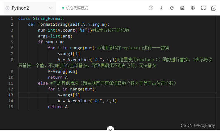 该代码实现了一个字符串格式化方法,根据给定的占位符(%s)和参数数组,将占位符替换为实际参数值。如果参数数量大于占位符,只使用占位符的数量;若等于,按顺序替换。