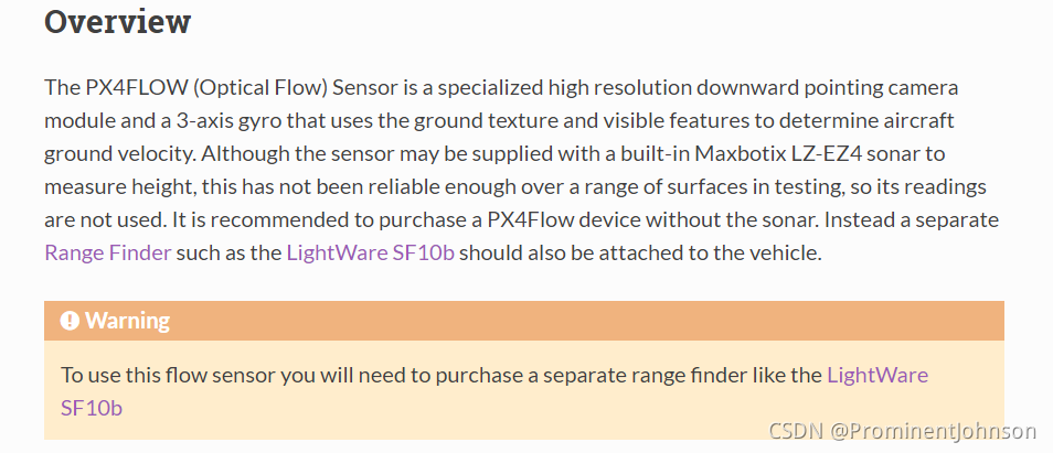 首先,要注意一个细节。虽然PX4FLOW模块上长着一个声呐测距模块,但是英语稍微好一点的朋友可以读懂,PX4FLOW根本就没有使用这个模块,然而依据光流的原理,需要有一个测距模块作辅助测量,所以没有测距,无人机是无法实现悬停的。而且官网教程一这个“Warning”中也写道,让你去买一个额外的测距。所以当你看到有些博客说他自己没有配测距,光靠PX4FLOW最后就实现悬停了,博主认为是很不可信的。