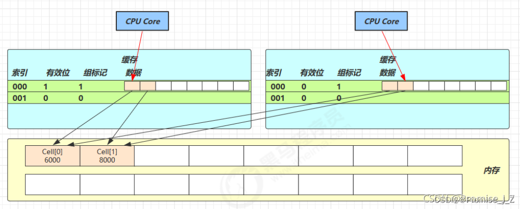 Cell[0]=6001, Cell[1]=8000 ,这时会让 Core-1 的缓存行失效