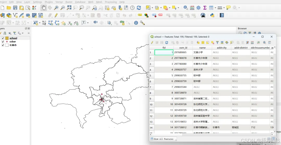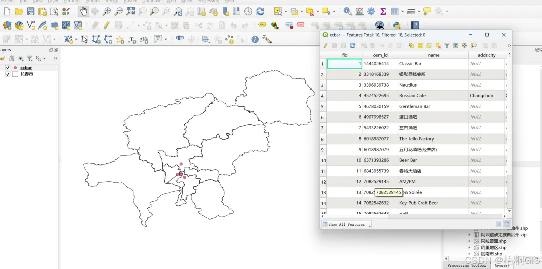 我们在QGIS中打开看一下数据是否正常,看起来不错,名字都挺不错的。