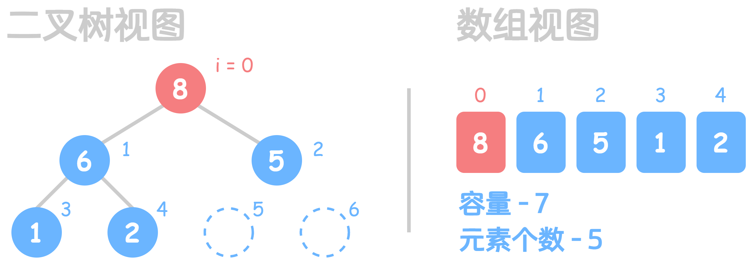 二叉堆中的元素可以存储在数组中,初始化时指定二叉堆的容量(最多能存储的元素个数),同时传入一个函数,用于决定是大堆还是小堆。