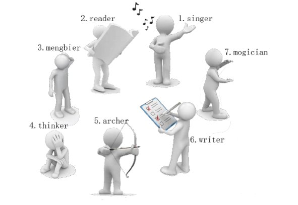 小南有一套可爱的玩具小人, 它们各有不同的职业。