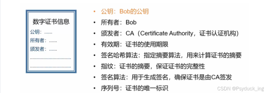 数字证书是网络世界中的身份证,它包含了持有者的公钥、用途、颁发者、有效时间和CA的签名等信息,用于在网络中建立安全可靠的信任关系。