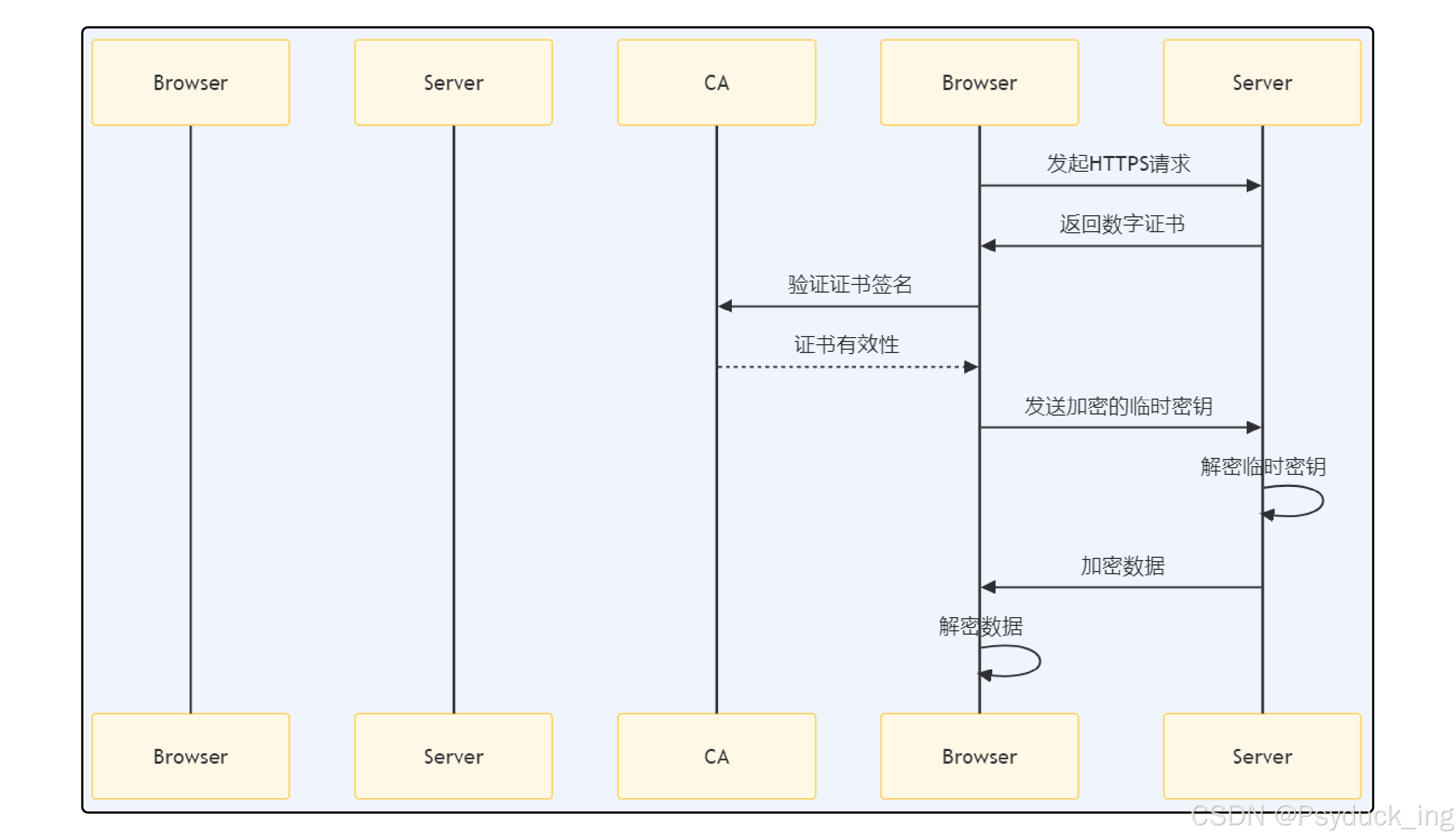 - 浏览器使用CA的公钥对证书签名进行校验:浏览器验证证书的有效性,包括证书是否过期、是否由可信CA签发。