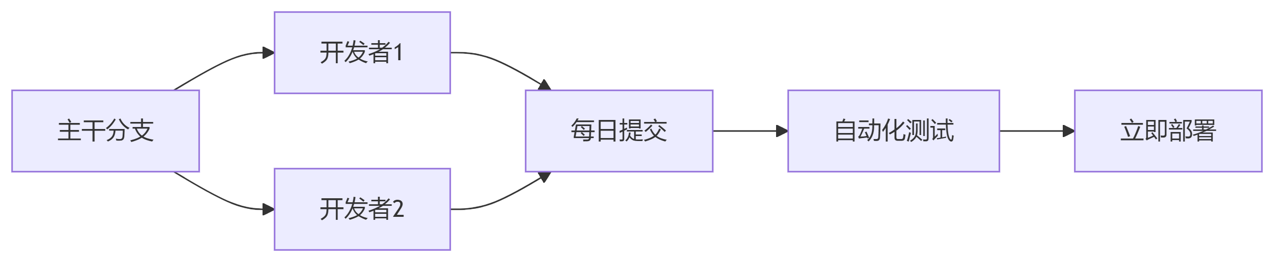 核心理念:所有开发者直接在主干分支上进行小批量、高频率的提交。