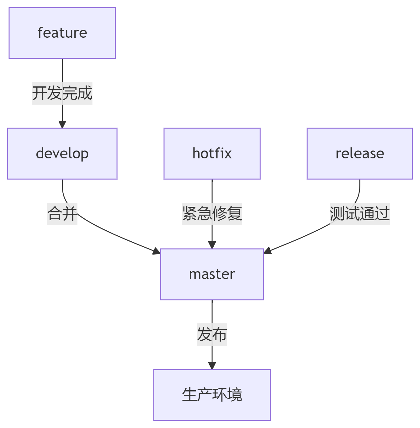 feature/:新功能开发bugfix/:修复非紧急bughotfix/:紧急修复生产环境问题release/:版本发布准备refactor/:代码重构docs/:文档更新test/:测试相关变更chore/:构建过程或辅助工具变动