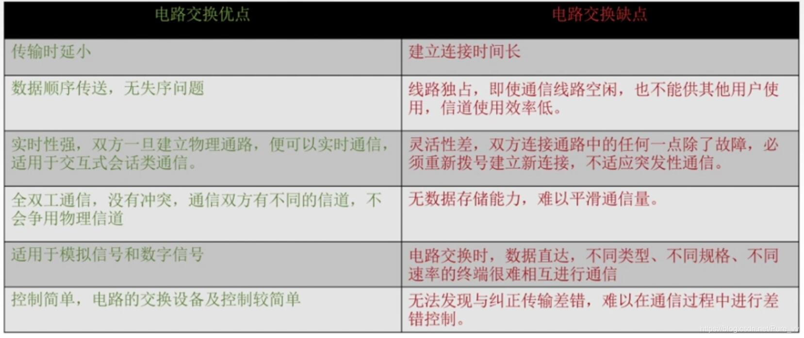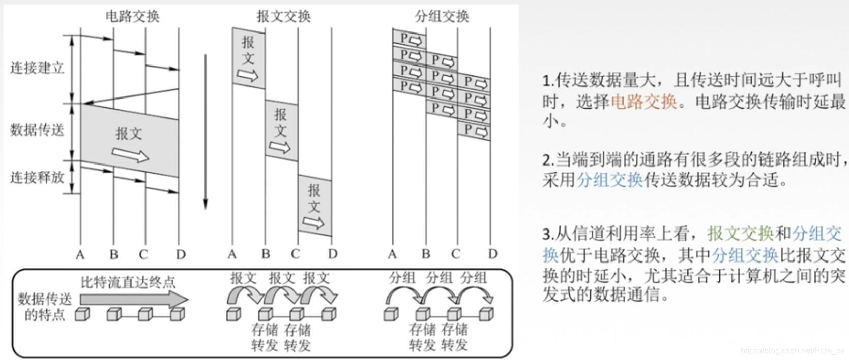 电路交换(独占电路)、报文交换、分组交换(小片报文)
