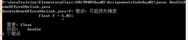 1 //[F:\JavaTraining\ElementaryClass\20170403Day02\AssignmentsCodeDay02\DoubleDemoOfEzraOholiab.java] 2 //定义一个float型变量f并赋初始值为5.03 3 float f = 5.03; 4 //打印f 5 System.out.println("f=" + f);
