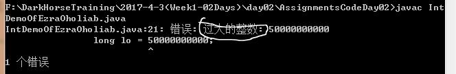 1 //[F:\JavaTraining\ElementaryClass\20170403Day02\AssignmentsCodeDay02\ IntDemoOfEzraOholiab.java] 2 //定义一个long型变量lo并赋初值为500亿 3 long lo = 50000000000; 4 //打印lo 5 System.out.println("lo=" + lo);