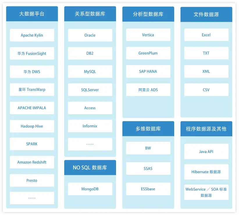 BI工具基本上都支持多维度的数据源,比如Excel、文本数据、数据库、大数据、云平台等。