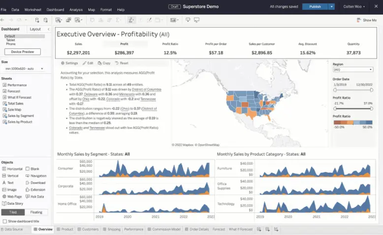 前面我们也说过,Tableau可视化能力最强,图表也更美观。其图表配色、结构、渲染非常适合商业分析,小白也能做出高大上的看板。