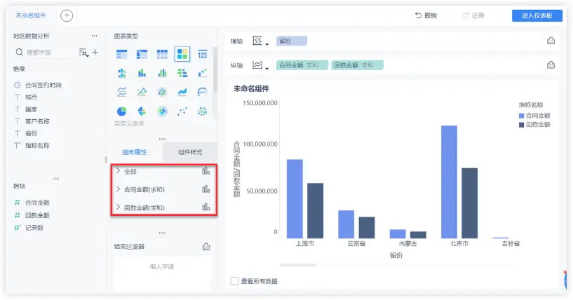 图表组件存在多个指标字段时,每个指标字段的图形属性是可以单独设置的。