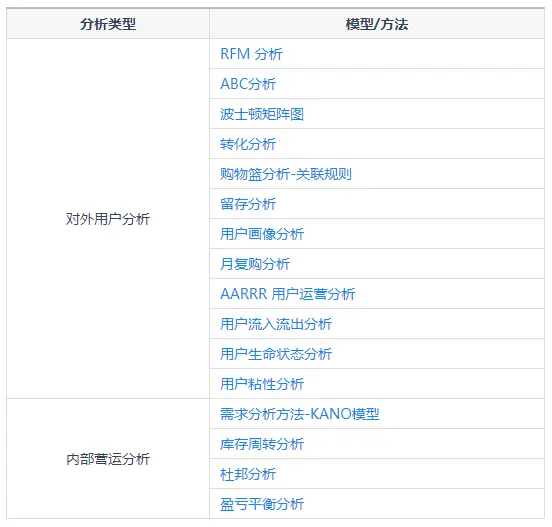 除了预测建模,FineBI具备优势的一点在于集成了很多商业模型,可以用数据分析中,比如RFM、AARRR等。