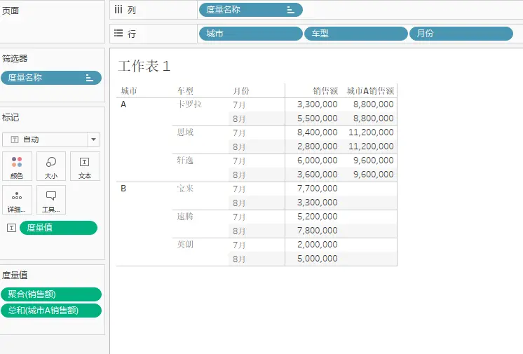 案例一:计算不同车型A城市的总销售额,不区分月份。