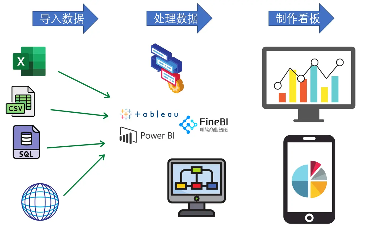其实不然,使用BI工具有一套完善的流程,目地是构建一套数据看板,就像产品开发一样。